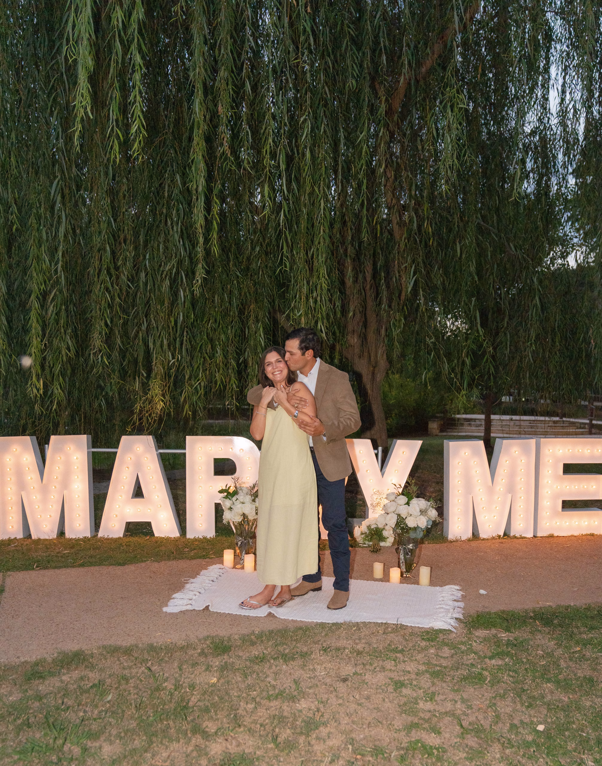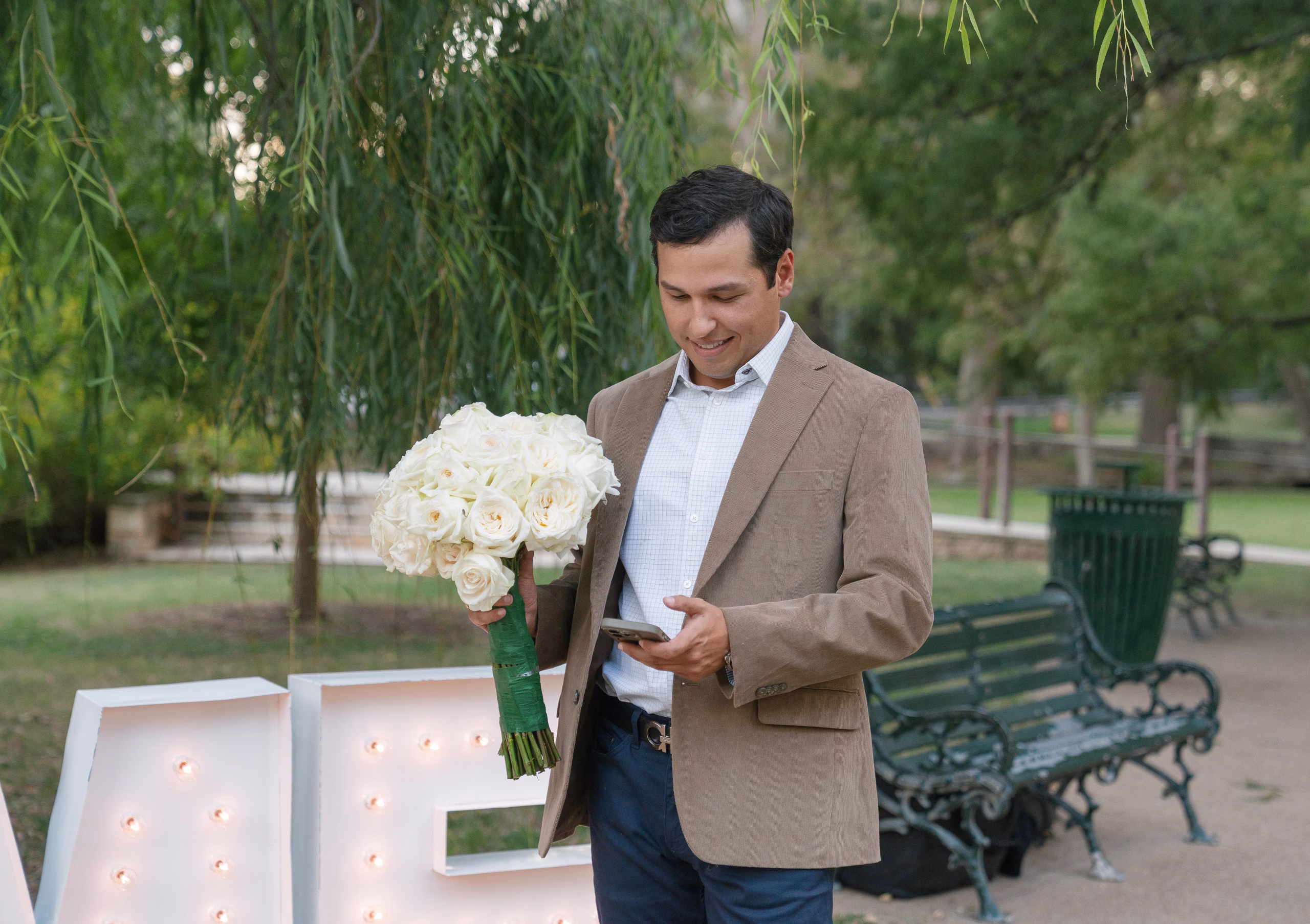 Diego knew he wanted something unforgettable when he asked Camryn to marry him. It couldn’t have been more beautiful. A willow tree in Landa Park in New Braunfels. A guitarist playing soft love songs. White roses covering the ground. A glowing “Marry Me” sign waiting just beneath the branches.